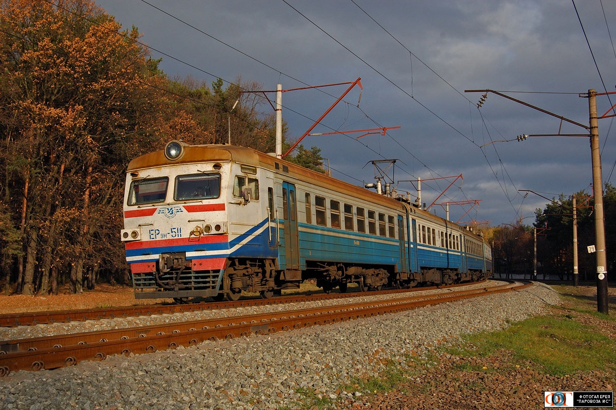| Электропоезд ЭР9М-511, перегон Буча - Ирпень между пл. Лесная Буча и ст. Ирпень, Киевская обл. Автор: OldNick | Фото сделано 5.XI.2007, опубликовано 26.V.2017.