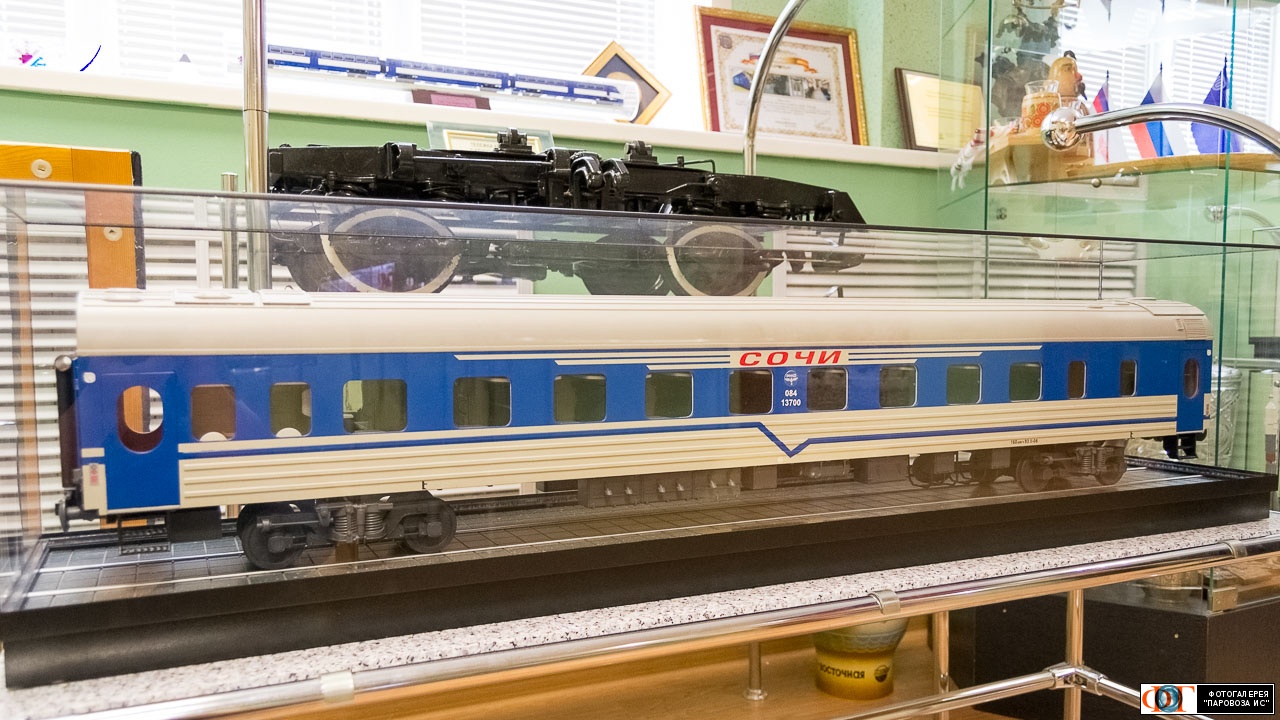 | Модель пассажирского вагона в окраске поезда "Сочи", музей Тверского вагоностроительного завода, Тверская обл. Автор: StepanovkA | Фото сделано 27.VI.2016, опубликовано 4.VIII.2017.