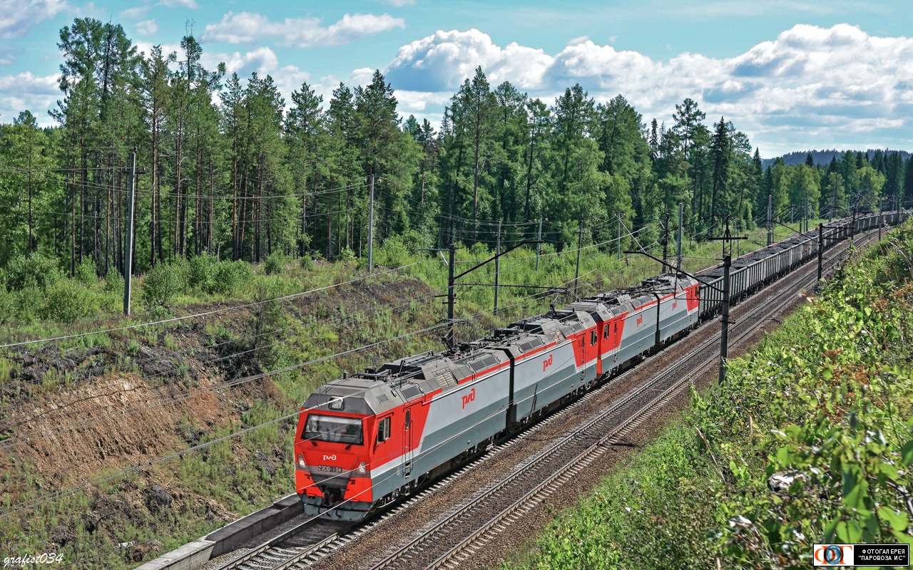 | Электровозы 2ЭС10-104/027 по СМЕ с грузовым поездом на перегоне Сабик - Сарга, Свердловская обл. Автор: grafist034 | Фото сделано 6.VIII.2016, опубликовано 6.VIII.2017.