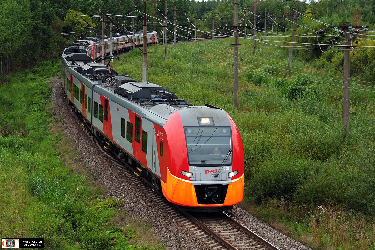| Электропоезда ЭС1-038 и ЭС1-032 "Ласточка" сообщением Великий Новгород - Санкт-Петербург, перегон Новгород-на-Волхове - разъезд 64 км, Новгородская обл. Автор: Иван Васильев | Фото сделано 3.IX.2017, опубликовано 4.IX.2017.
