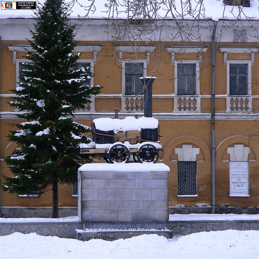 - Надпись на постаменте: "Первый паровоз в России, созданный механиками Е.А. и М.Е. Черепановыми в 1834 году. Макет установлен в 1984 году к 150-летию изобретения". Макет паровоза Черепановых установлен на своей "исторической родине" - в Нижнем Тагиле, у входа в городской музей-заповедник "Горнозаводской Урал". На Выйском заводе, который входил в состав Нижнетагильских заводов, принадлежавших Демидовым, отец и сын Ефим Алексеевич и Мирон Ефимович Черепановы построили целиком из отечественных материалов первый в России паровоз и назвали его "сухопутным пароходом". Буква "М" на фасаде дома - от "Музей". -- Ирина
