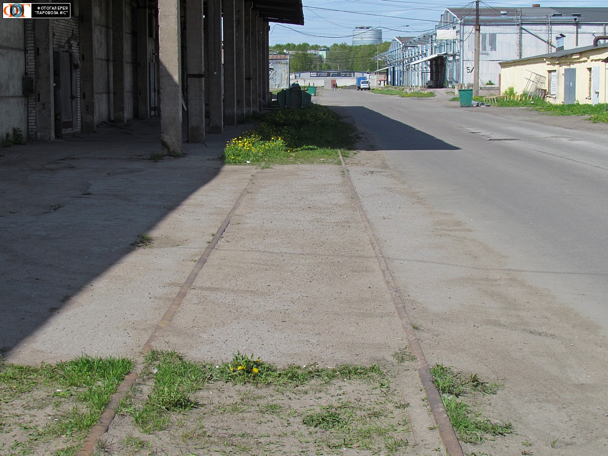 | Остатки пути на территории ЗАО "Приморское объединение" (бывшая Ждановская овощебаза), разобранный подъездной путь от ст. Новая Деревня, Санкт-Петербург Автор: А.М. | Фото сделано 28.V.2017, опубликовано 4.II.2018.
