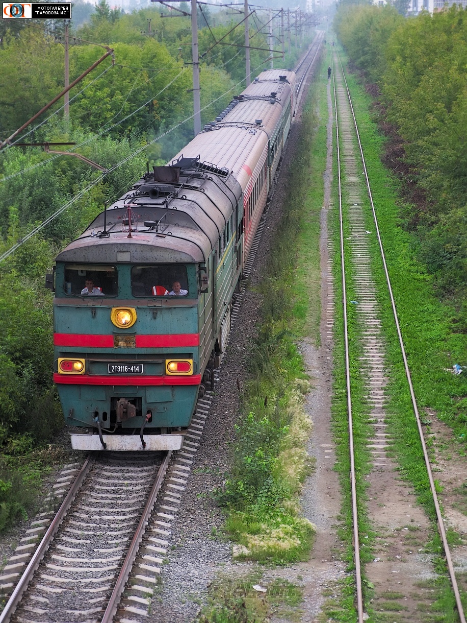 | Тепловоз 2ТЭ116-414 с пригородным поездом, перегон Путёвка (парк ст. Шарташ) - Аппаратная, Свердловская обл. Автор: IAGSoft | Фото сделано 21.VIII.2014, опубликовано 18.XI.2018.