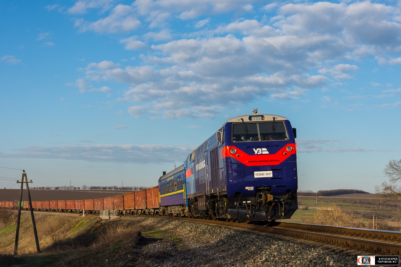 | Тепловоз ТЭ33АС-2027 с грузовым поездом, перегон Сурское - Встречный, Днепропетровская обл. Автор: Vyacheslav | Фото сделано 3.IV.2019, опубликовано 4.IV.2019.