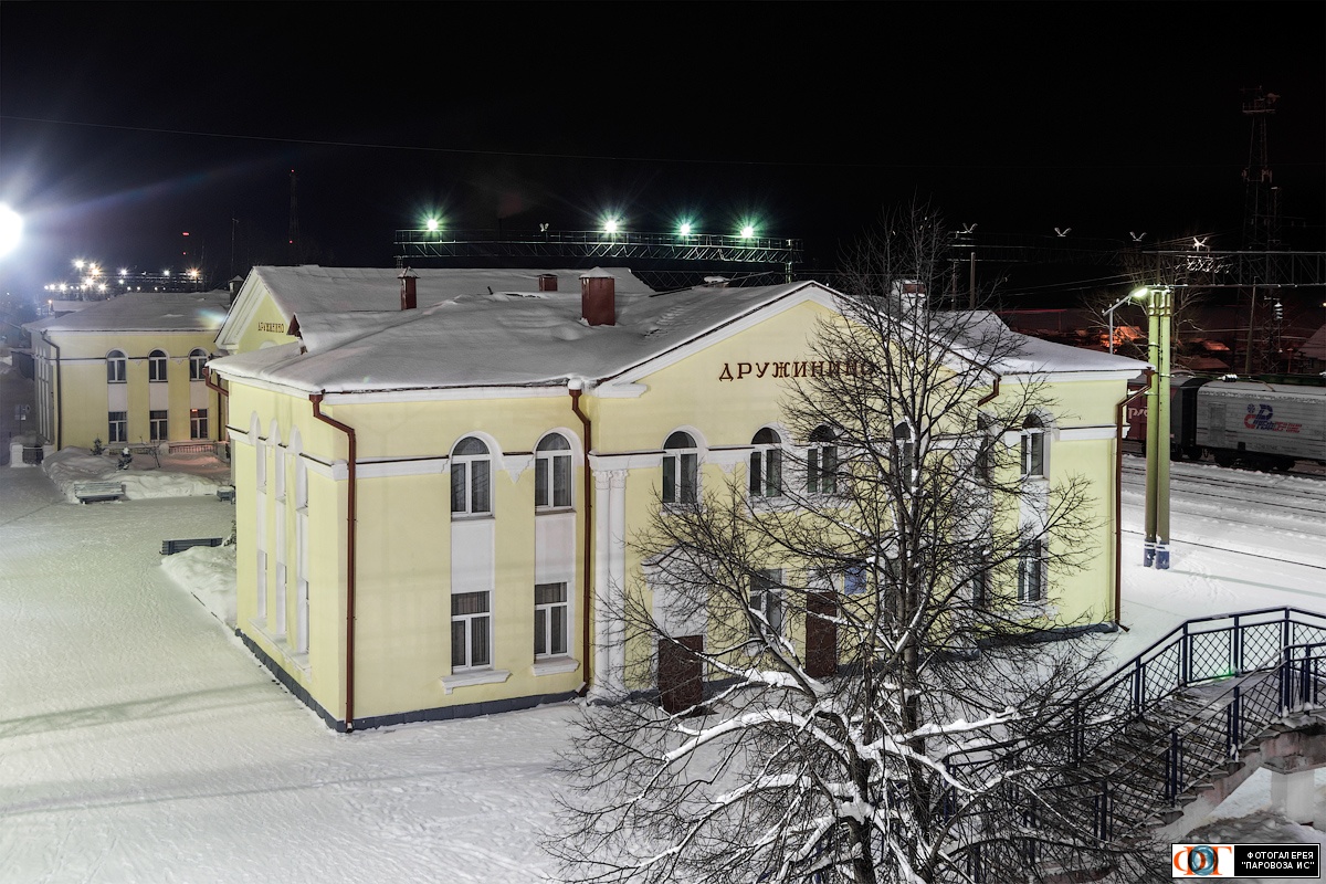 | Здание вокзала, станция Дружинино, Свердловская обл. Автор: Алексей Задонский | Фото сделано 27.XII.2015, опубликовано 16.XI.2019.