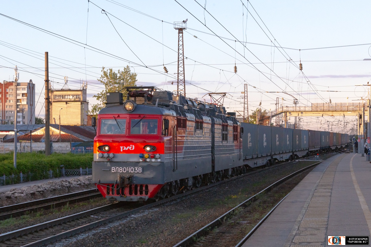 | Электровоз ВЛ80С-1038 с контейнерным поездом, станция Дзержинск, Нижегородская обл. Автор: Alexandr Zaleskiy | Фото сделано 27.V.2020, опубликовано 3.VI.2020.