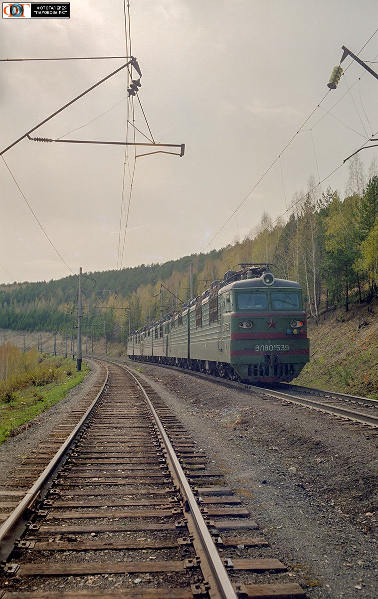 | Электровоз ВЛ80С-539 на перегоне блок-пост 1429 км - Саранинский Завод, Свердловская обл. Автор: Огнев О. В. | Фото сделано 10.V.1999, опубликовано 18.VII.2020.