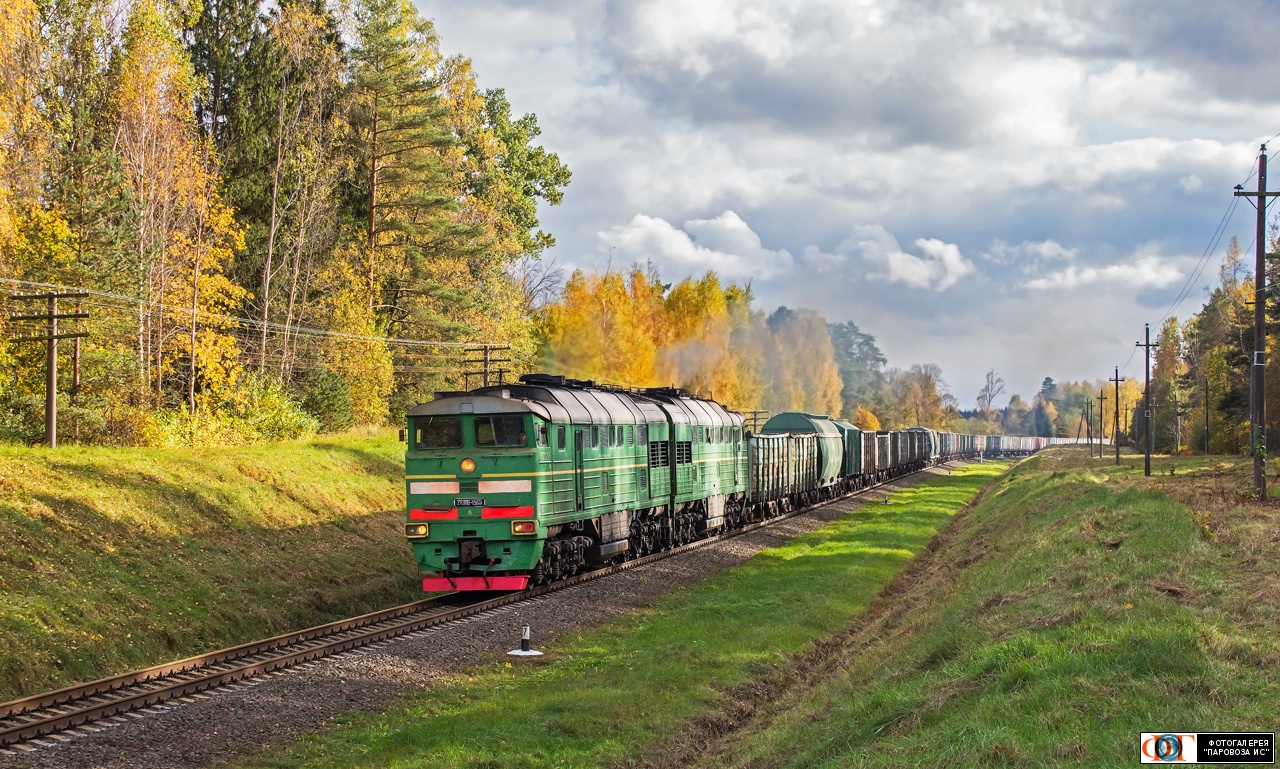 | Тепловоз 2ТЭ116-1565 с грузовым поездом следует по перегону Лужесно — Лосвида, Витебская обл. Автор: VitoBY | Фото сделано 16.X.2020, опубликовано 28.X.2020.