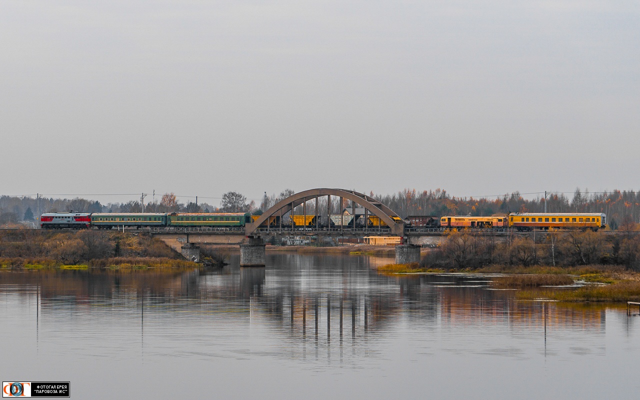 | Тепловоз ДМ62-1782 с хозяйственным поездом на мосту через р. Хотча, перегон Калязин-Пост - Белый Городок, Тверская обл. Автор: Const (колл.) | Фото сделано 31.X.2020, опубликовано 7.XI.2020.