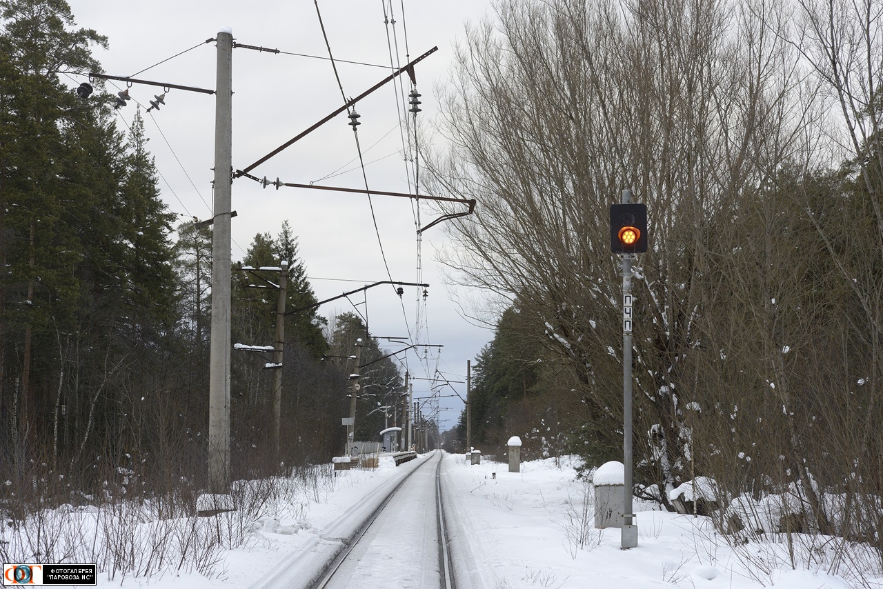 | Чётный предупредительный светофор ПЧП, перегон Посёлок - Вырица у Второй Платформы, Ленинградская обл. Автор: OldNick | Фото сделано 12.II.2022, опубликовано 24.II.2022.