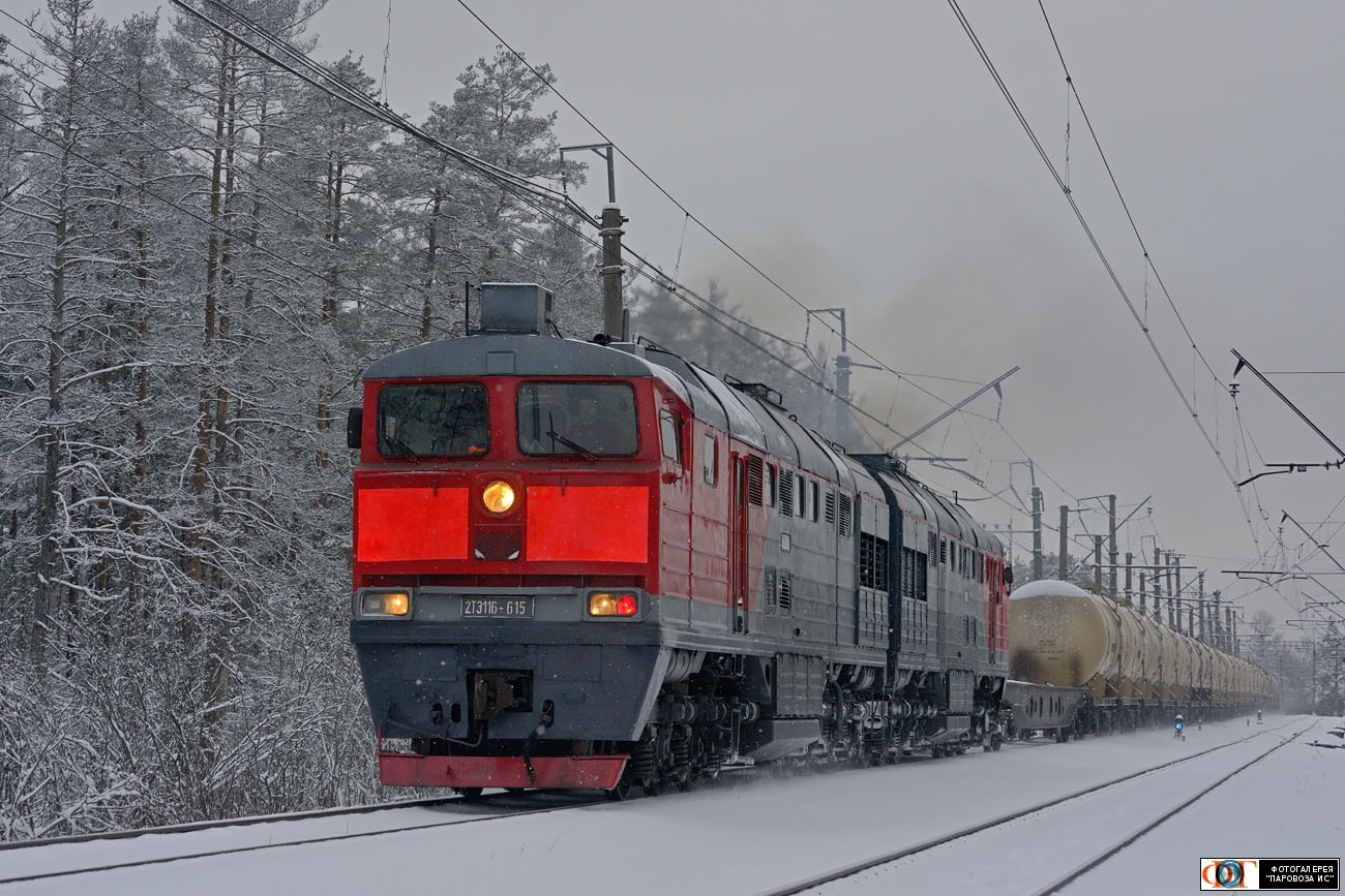 | Тепловоз 2ТЭ116-615 с грузовым поездом, ст. Вырица, Ленинградская обл. Автор: OldNick | Фото сделано 4.I.2023, опубликовано 10.I.2023.
