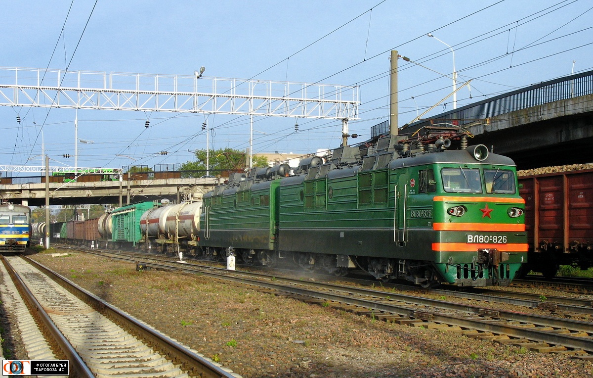 | Электровоз ВЛ80Т-826 с грузовым поездом на станции Минск-Сортировочный, Минск Автор: леха | Фото сделано 28.IX.2011, опубликовано 30.VI.2023.