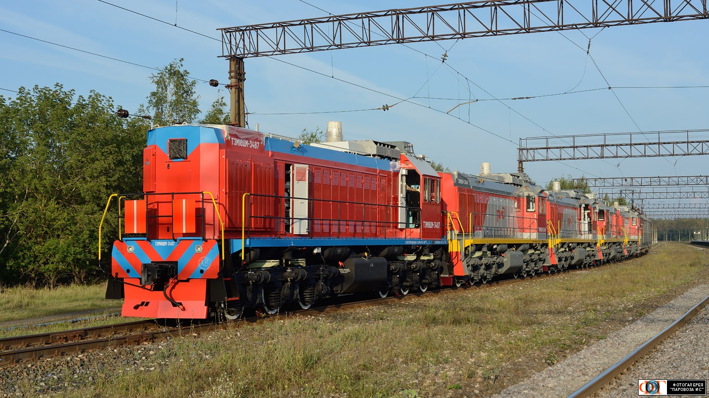 | Тепловозы ТЭМ18ДМ-3487, ТЭМ18ДМ-2048, ТЭМ18ДМ-2046, ТЭМ18ДМ-2045, ТЭМ18ДМ-2047 и электровоз ВЛ11М-376 на ст. Торфопродукт, Владимирская обл. Автор: OldNick | Фото сделано 11.IX.2023, опубликовано 16.IX.2023.