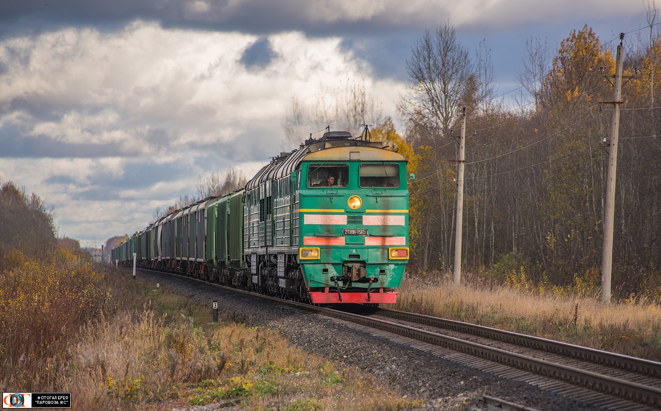 | Тепловоз 2ТЭ116-1565 с грузовым поездом, перегон Гачки - 241 км, Псковская обл. Автор: Pifon | Фото сделано 16.X.2021, опубликовано 6.X.2023.