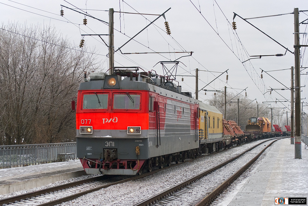 | Электровоз ЭП1-077 следует с хозяйственным поездом по перегону Кизитеринка - Александровка, Ростовская обл. Автор: Антон Савченко | Фото сделано 17.XII.2023, опубликовано 20.XII.2023.