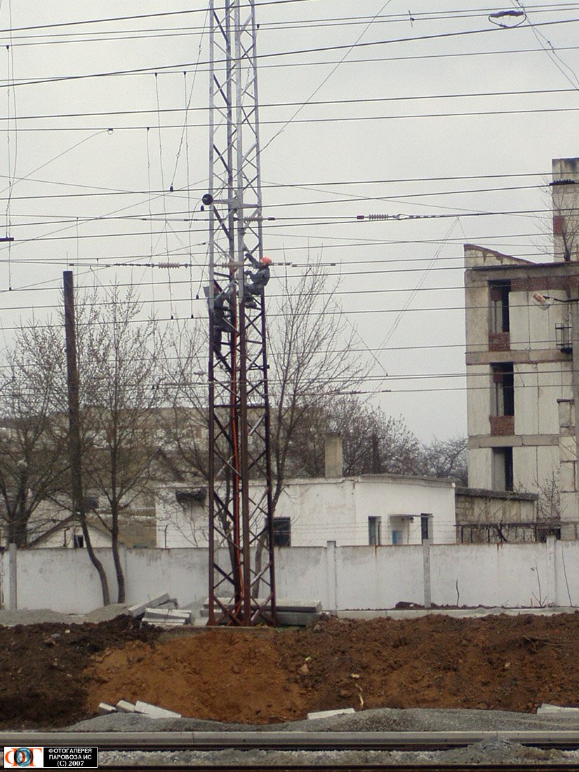 | Покраска новых опор КС на ст. Джанкой, Крым Автор: Helgi | Фото сделано 3.IV.2007, опубликовано 10.IV.2007.