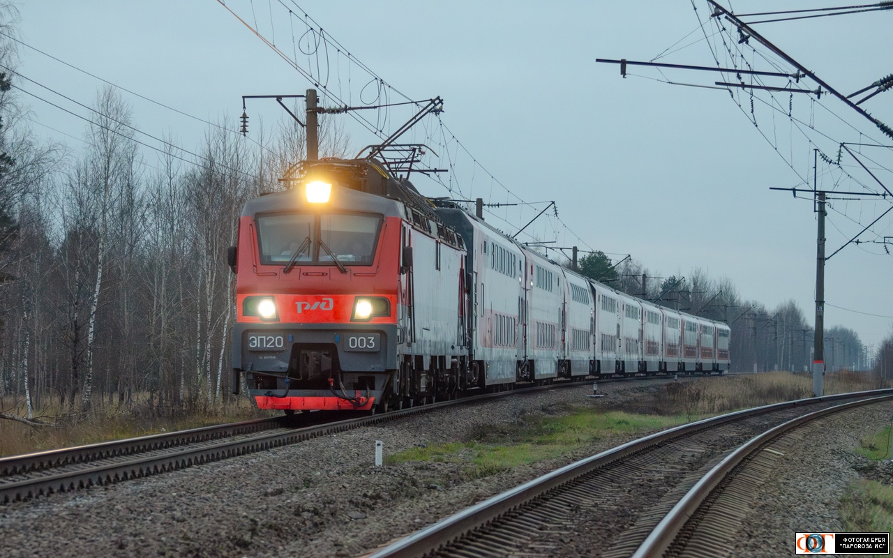 | Электровоз ЭП20-003 с поездом №108 Брянск - Москва, перегон Полпинская - Чернец, Брянская обл. Автор: Lag | Фото сделано 6.XI.2022, опубликовано 15.VI.2025.