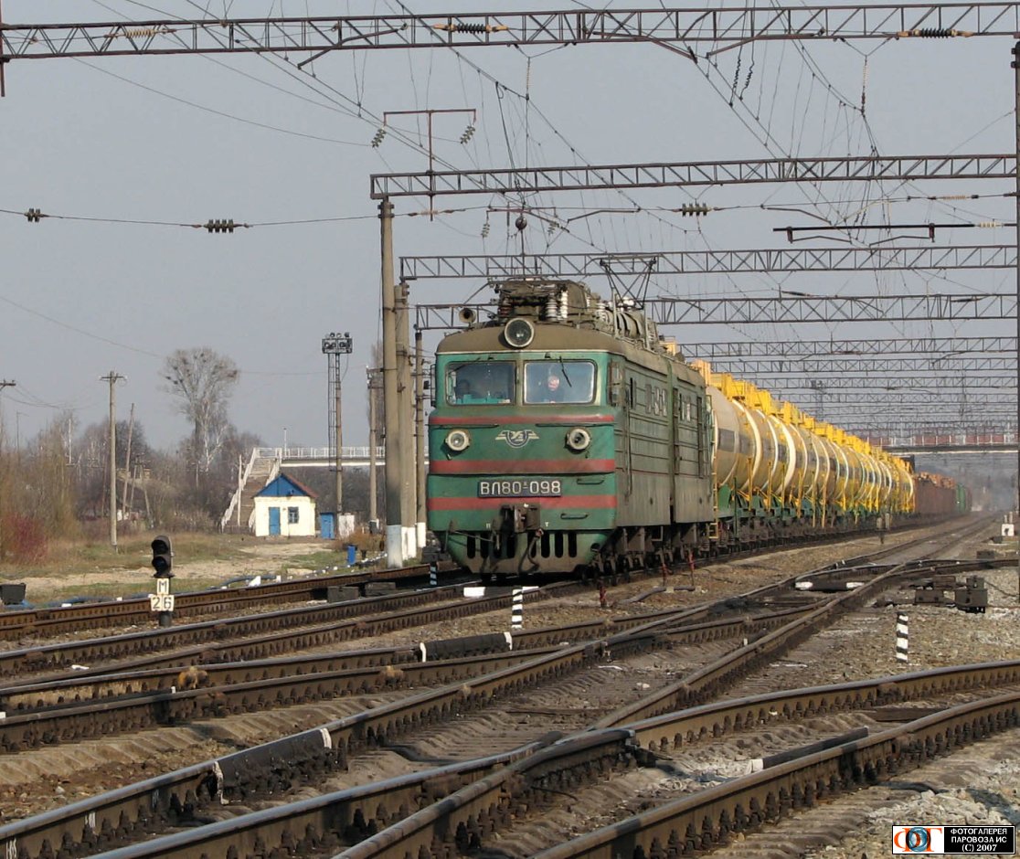 | Электровоз ВЛ80К-098 проходит ст. Бахмач-Пасс., Черниговская обл. Автор: Филипченко Геннадий | Фото сделано 31.III.2007, опубликовано 16.IV.2007.