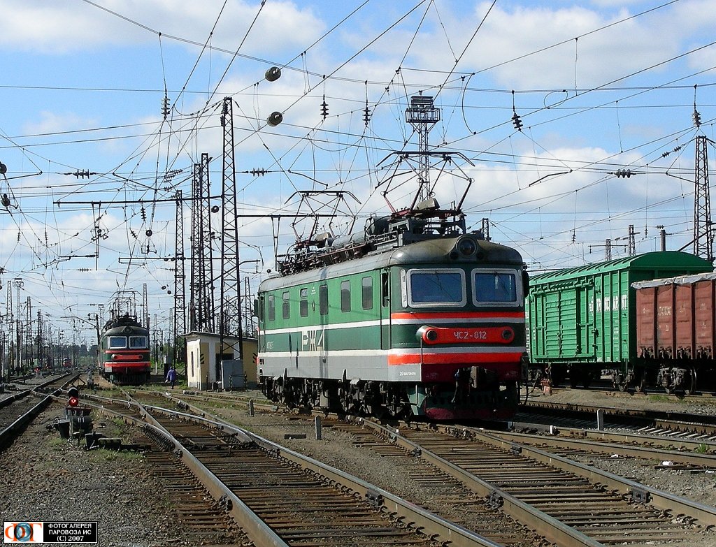 Электровоз ЧС2-812 пришел на смену электровозу ЧС4Т-303 (ЧС4Т спрятался на соседних путях за бортом ЧС2). Поезд № 8 Москва - Свердловск. На заднем плане - электровоз ЧС2-119 в ожидании "своего" поезда. -- Ирина