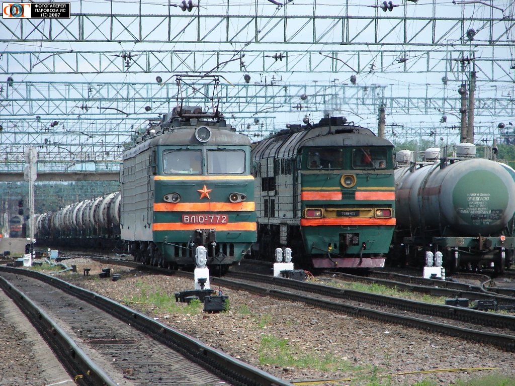 | "Кто кого?" Электровоз ВЛ10У-772 и тепловоз 2ТЭ116-428, ст. Волоколамск, Московская обл. Автор: Volkoff | Фото сделано 11.VI.2007, опубликовано 8.VIII.2007.