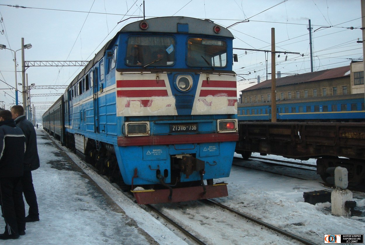 | Тепловоз 2ТЭ116-736 с поездом сообщением Мануиловка - Дебальцево, ст. Дебальцево, Донецкая обл. Автор: Andress | Фото сделано 10.III.2006, опубликовано 12.VIII.2007.