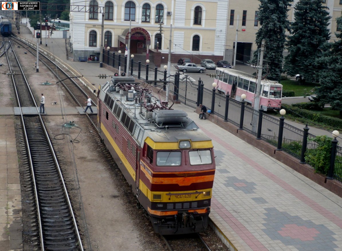 | Электровоз ЧС4Т-420 (ТЧ Балашов) на путях станции и вагон трамвая КТМ-5 на конечной, станция Воронеж-I, Воронежская обл. Автор: Губин Александр | Фото сделано 16.VIII.2007, опубликовано 18.VIII.2007.