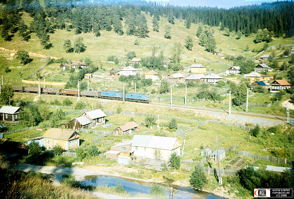 | Электровозы ВЛ22м с грузовым поездом на перегоне Ермак - Чусовская, Пермский край Автор: Огнев О. В. | Фото сделано 21.VIII.1990, опубликовано 2.XII.2008.