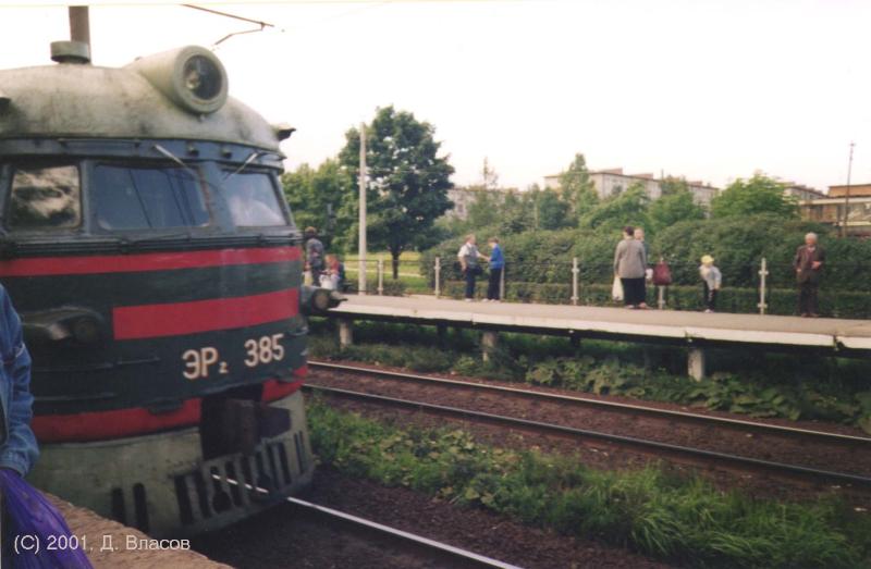 | Электропоезд ЭР2-385 { ER2-385 EMU train }, Старый Петергоф { Stary Petergof }, Санкт-Петербург Автор: Власов Д. | Фото сделано VIII.2001, опубликовано 21.X.2001.