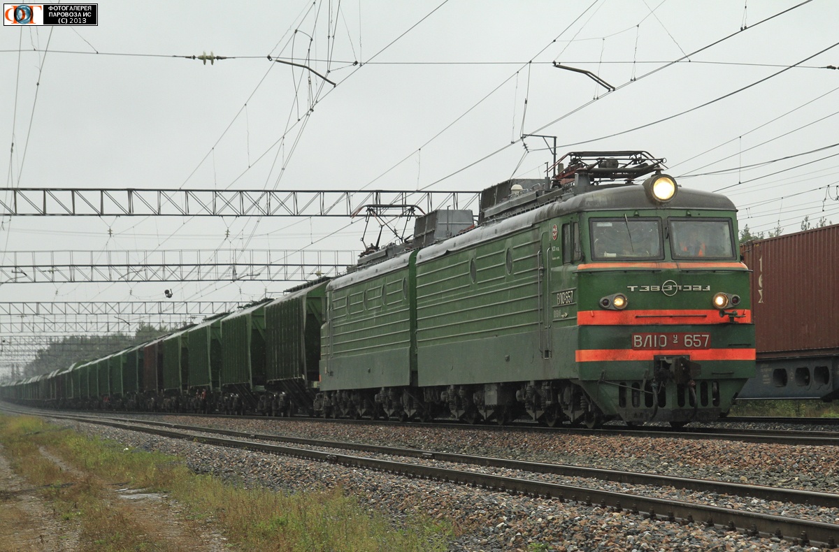 | Электровоз ВЛ10У-657 с грузовым поездом, ст. Ильичёв, Владимирская обл. Автор: Максимов Юрий | Фото сделано 15.IX.2013, опубликовано 21.IX.2013.