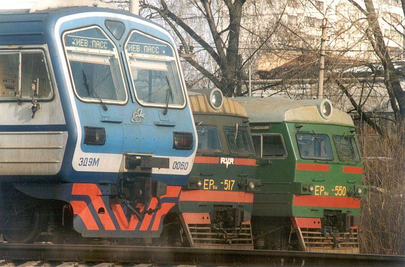 | Электропоезда ЭД9М-0060, ЭР9М-517 и ЭР9М-550 { ED9M-0060, ER9M-517, and ER9M-550 EMU trains }, Борщаговка-Технич. { Borshchagovka-Tekhn. }, Киев Автор: Андрей Порев | Фото сделано 1.II.2003, опубликовано 27.II.2003.