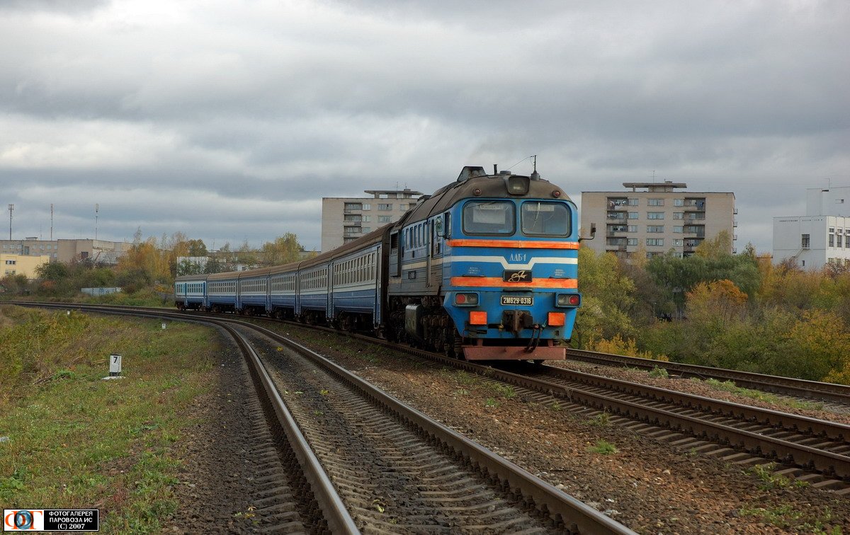 | Тепловоз 2М62У-0316 в составе дизель-поезда ДРБ1-014, перегон Могилев-II - Могилев-I, Могилёвская обл. Автор: Andy T | Фото сделано 14.X.2007, опубликовано 10.XI.2007.