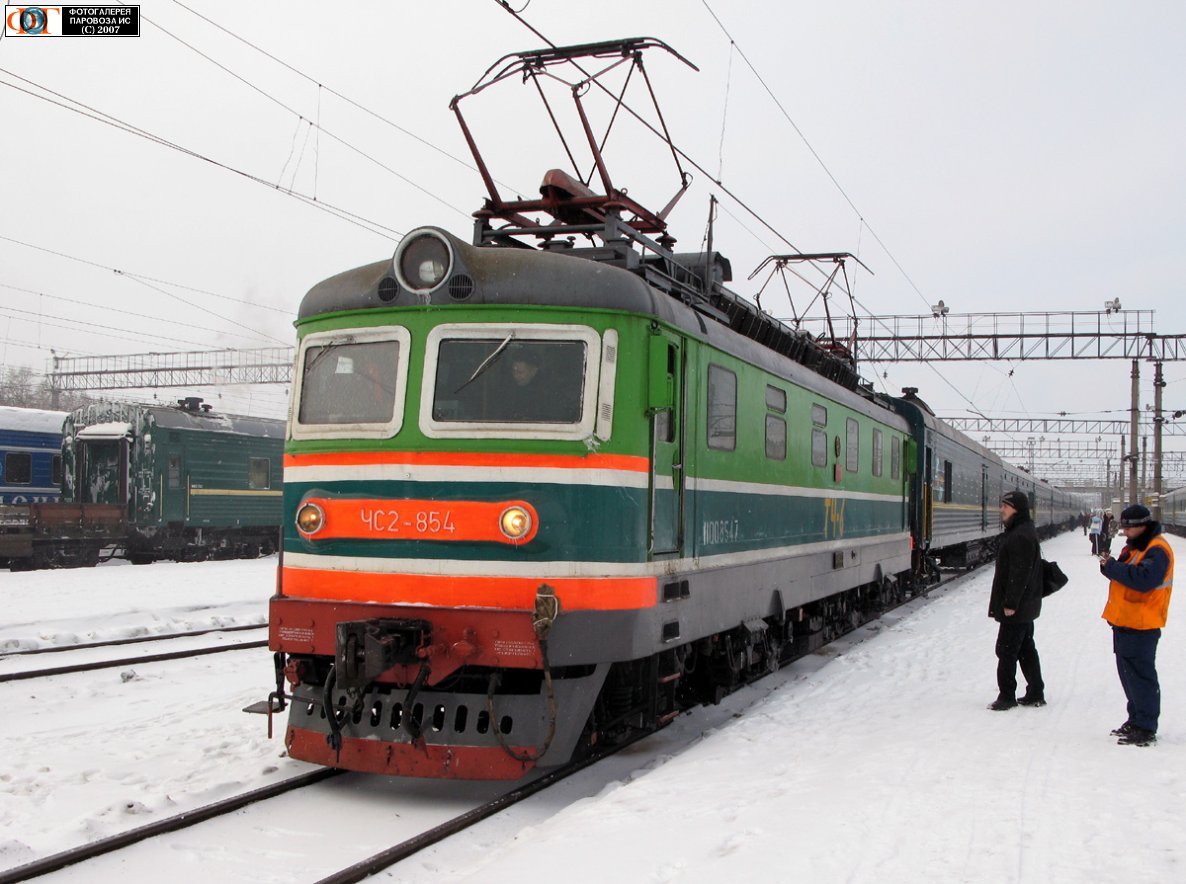 | Электровоз ЧС2-854 с поездом "Саяны" Москва - Абакан на ст. Тюмень, Тюменская обл. Автор: Александр GM | Фото сделано 18.XII.2007, опубликовано 30.XII.2007.