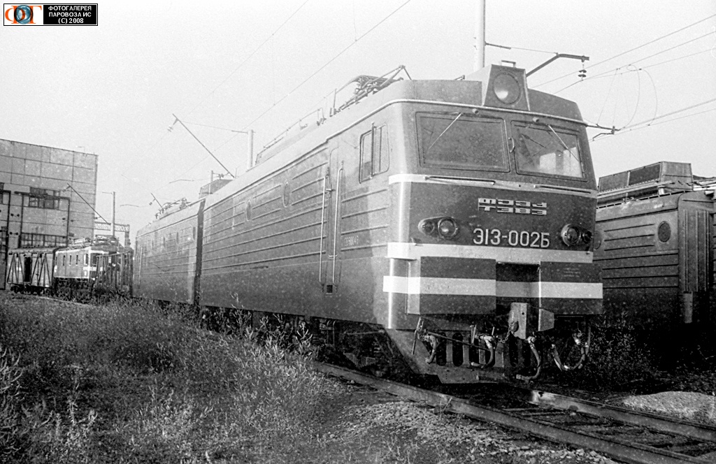 - Прошу прощения за качество, плёнка оказалась с браком. Может, кто-нибудь подскажет, как пятна убрать? Электровоз только что прибыл с ТЭВЗ. Э13-001 уже вовсю ходит с поездами в Перми. -- Огнев О. В.