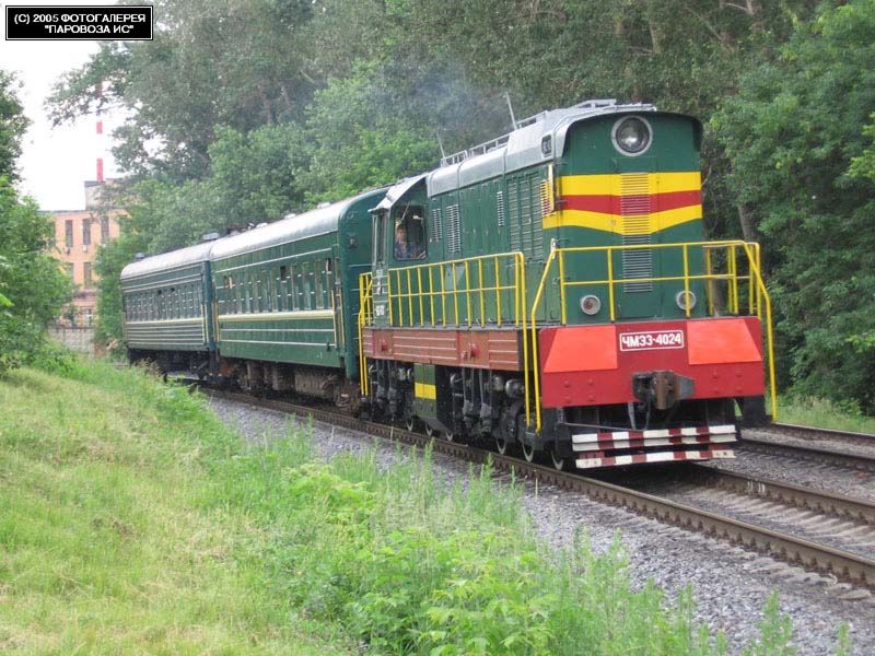 | Московская "кукушка" { "Choo-choo" train } с тепловозом ЧМЭ3-4024, окрестности ст. Канатчиково { Kanatchikovo station surrounds }, перегон Кожухово - Канатчиково, Москва Автор: Терентьев О. | Фото сделано 18.VI.2005, опубликовано 30.VI.2005.