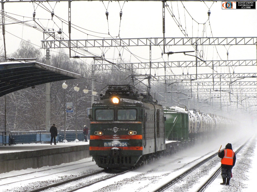 | Электровоз ВЛ10-304 в голове грузового поезда, платформа Тайнинская, перегон Лосиноостровская - Мытищи, Московская обл. Автор: GiG | Фото сделано 16.I.2009, опубликовано 17.I.2009.