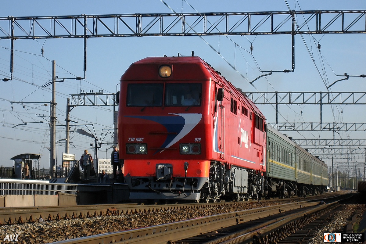 | Тепловоз ТЭП70БС-018 с пригородным поездом Санкт-Петербург - Ивангород, о.п. Ленинский проспект, Санкт-Петербург Автор: AlexVL | Фото сделано 10.V.2009, опубликовано 15.V.2009.