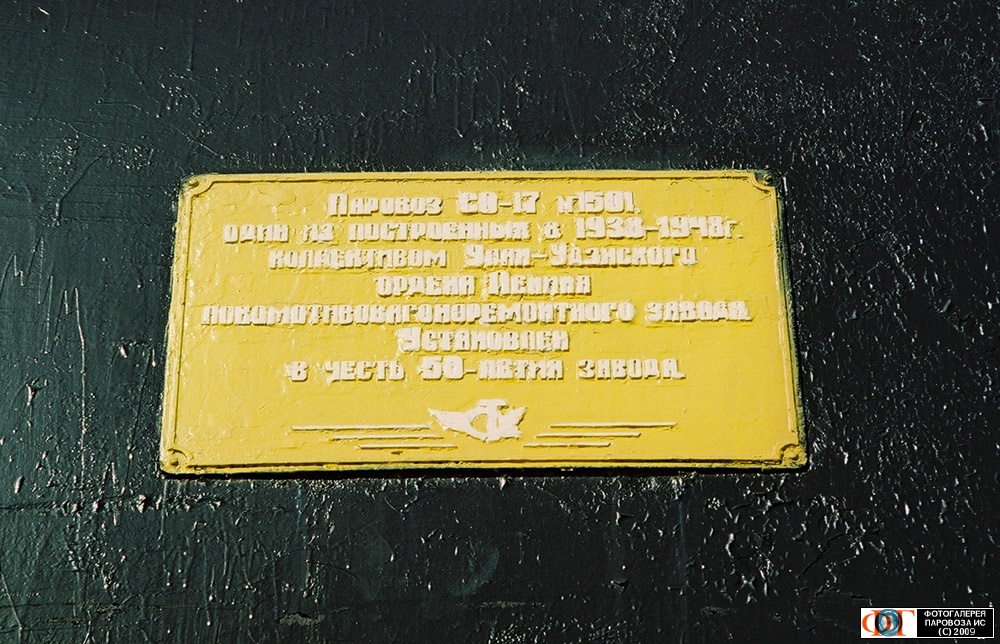 | Табличка паровоза-памятника СО17-1501, Улан-Удэнский локомотивовагоноремонтный завод, ул. Лимонова, Бурятия Автор: Турист | Фото сделано 12.VIII.2008, опубликовано 7.VI.2009.