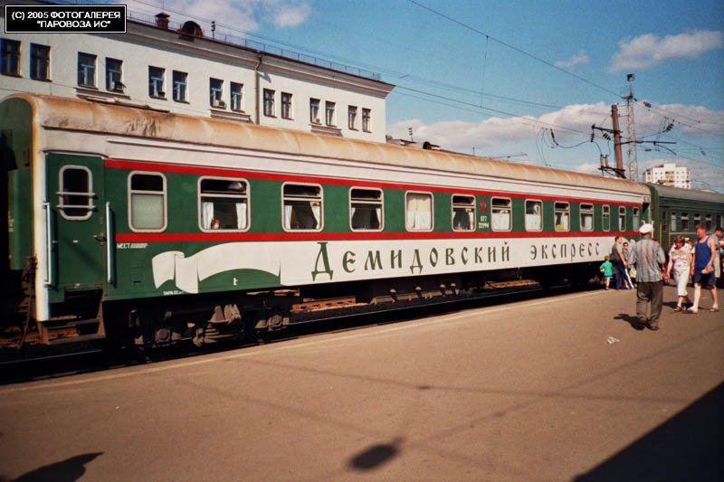 | Вагон поезда "Демидовский экспресс" { "Demidovsky ekspress" train }, ст. Пермь-II { Perm-II station }, Пермский край Автор: Аксёнов В. | Фото сделано 29.VIII.2005, опубликовано 20.IX.2005.