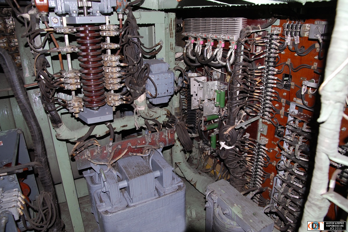 Слева по ходу, справа на фото — обратная сторона панели №3 [ ] , далее панель управления, содержащая аппараты питания цепей управления, в том числе хорошо видимые закреплённые на радиаторах диоды, выпрямляющие пониженное ТРПШ напряжение. А справа от ТРПШ, тоже на полу, виден дроссель Д1, сглаживающий пульсации выпрямленного напряжения 50 В. Над панелью управления стоит фазорасщепитель [ ] > >