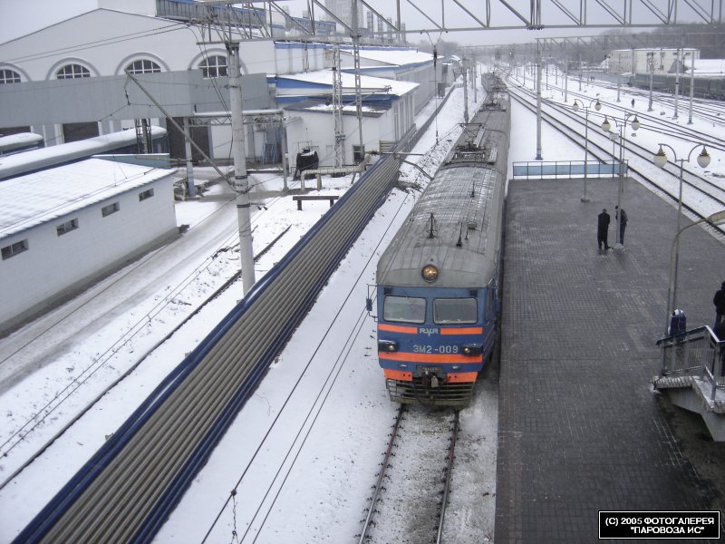 | Электропоезд ЭМ2-009 { EM2-009 EMU train }, станция Москва-III { Moskva-III station }, Москва Автор: Максимов Юрий | Фото сделано 10.XII.2005, опубликовано 20.XII.2005.