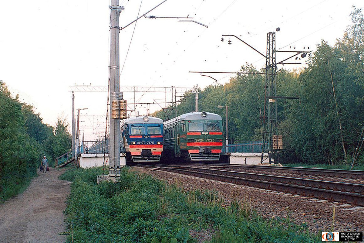 | Электропоезда ЭР2Т-7175 и ЭР2Р-7020, пл. 43 км перегона Электроугли - Храпуново, Московская обл. Автор: Фёдор Яшин† | Фото сделано 28.V.2005, опубликовано 29.XI.2010.