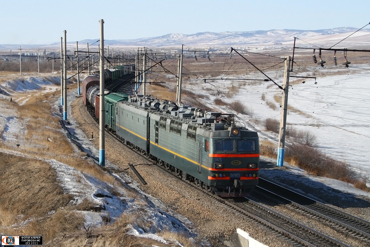 | Электровоз ВЛ85-145 на перегоне Кадала - Чита-I, Забайкальский край Автор: passar | Фото сделано 7.III.2011, опубликовано 17.III.2011.