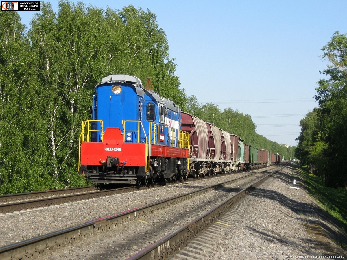 | Маневровый тепловоз ЧМЭ3-1246 с грузовым поездом на перегоне Белокаменная - Ростокино, Москва Автор: Денис Еськов | Фото сделано 25.V.2011, опубликовано 20.VI.2011.