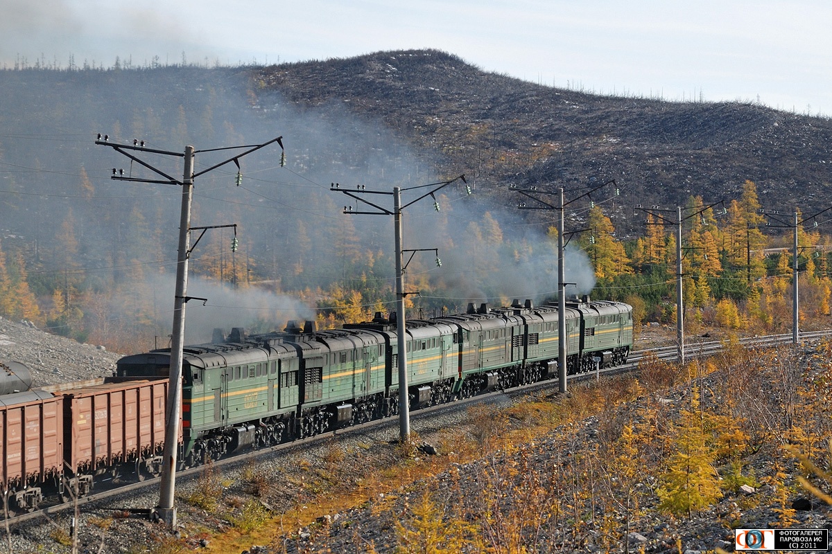 | Тепловозы 3ТЭ10У-0023 и 3ТЭ10У-0027 с грузовым поездом на перегоне Мурурин - Олонгдо, 1820 км. БАМа, Забайкальский край Автор: Баландин Д. | Фото сделано 13.IX.2009, опубликовано 13.VII.2011.