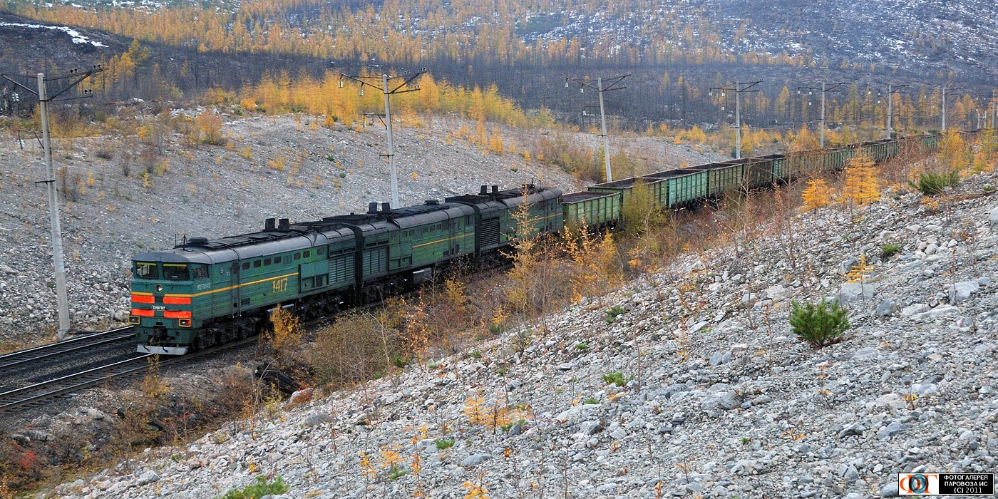 | Тепловоз-толкач 3ТЭ10М-1417 на 1820 км БАМа, перегон Олонгдо - Мурурин (панорамный кадр), Забайкальский край Автор: Баландин Д. | Фото сделано 13.IX.2009, опубликовано 16.VII.2011.