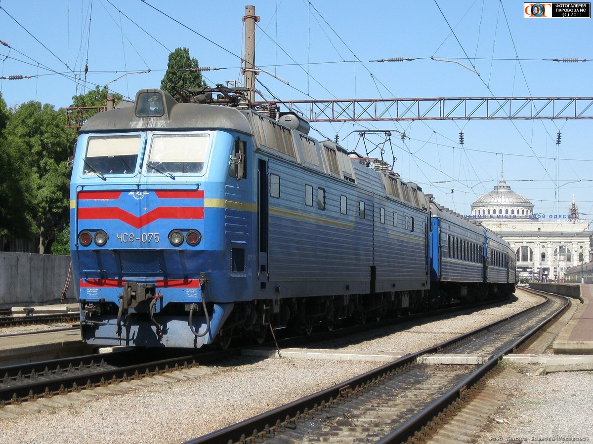 | Электровоз ЧС8-075 с пассажирским поездом на ст. Одесса-Главная, Одесская обл. Автор: Денис Еськов | Фото сделано 24.VIII.2011, опубликовано 8.X.2011.