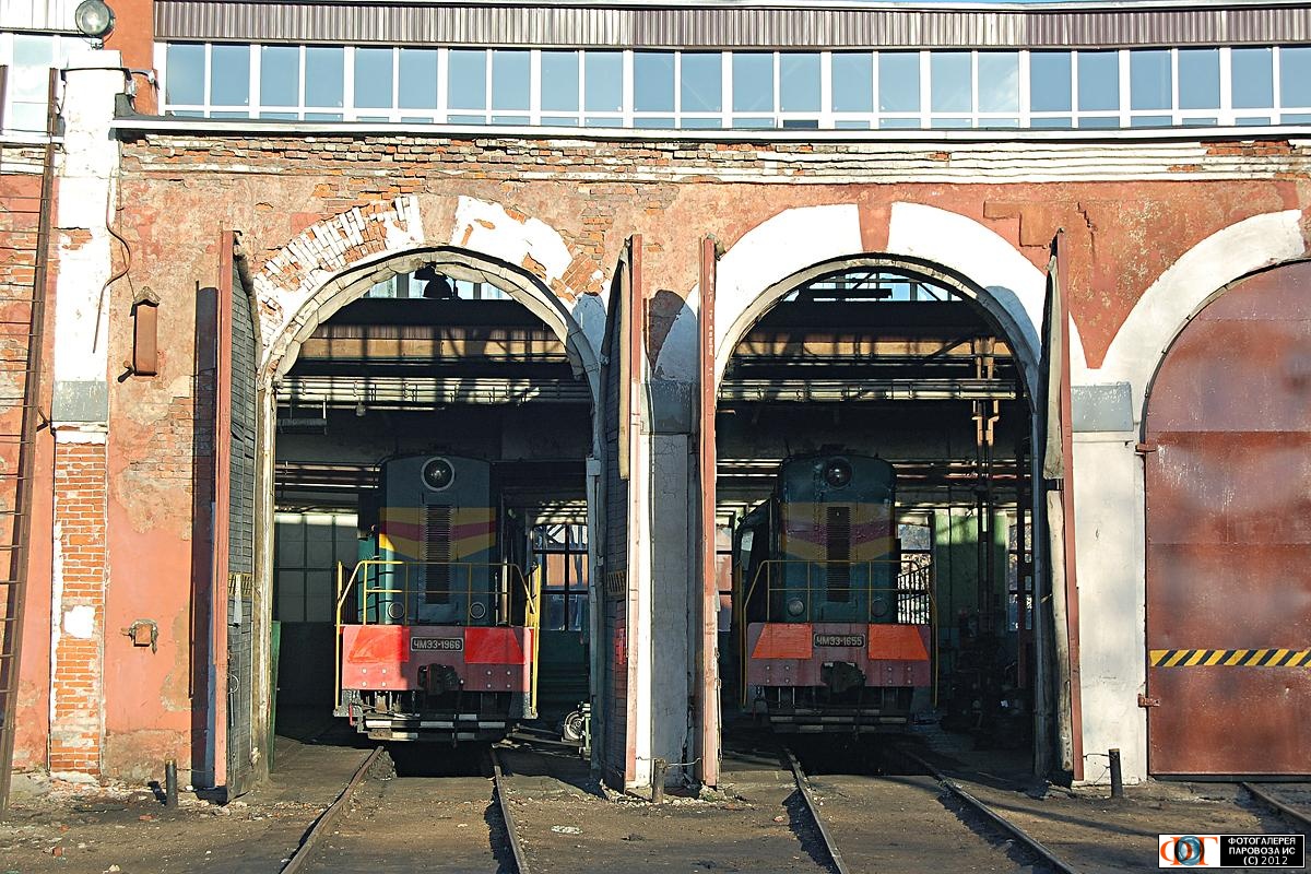 | Тепловозы ЧМЭ3-1966 и ЧМЭ3-1655 в цеху депо Подмосковная, Москва Автор: Фёдор Яшин† | Фото сделано 21.X.2008, опубликовано 16.IV.2012.