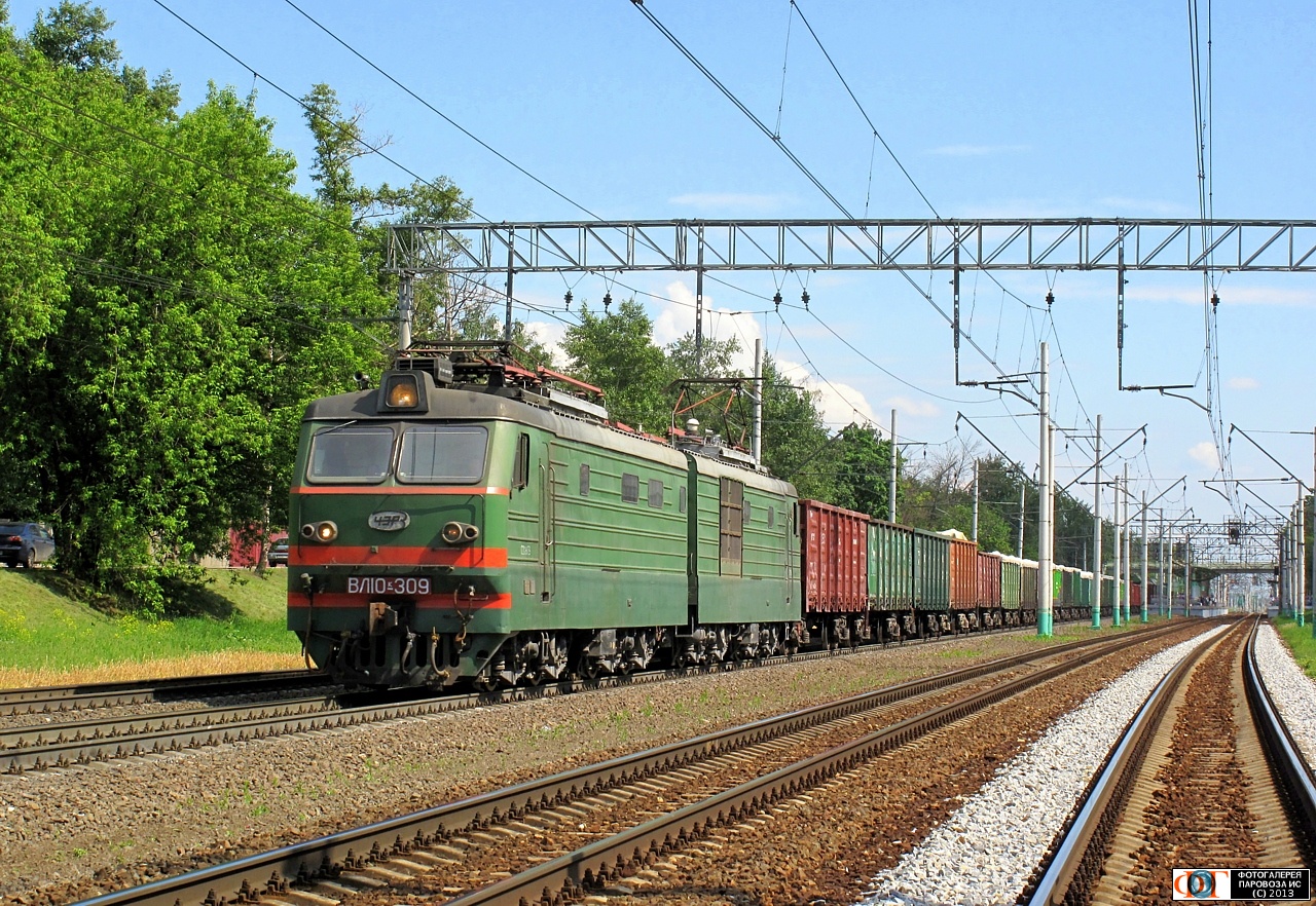 | Электровоз ВЛ10К-309 с грузовым поездом, перегон Люберцы-I - Перово вблизи пл. Ухтомская, Москва Автор: TimychKTR | Фото сделано 30.V.2013, опубликовано 26.VII.2013.