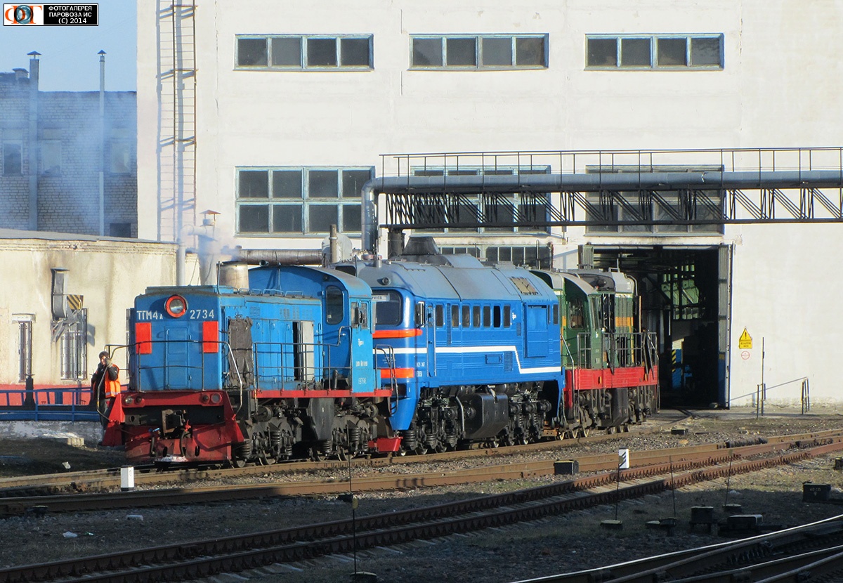 | Тепловоз ТГМ4А-2734 с секцией тепловоза 2М62У-0307А и тепловозом ЧМЭ3-4623 в депо Могилёв, Могилёвская обл. Автор: Игорь | Фото сделано 21.III.2014, опубликовано 24.III.2014.