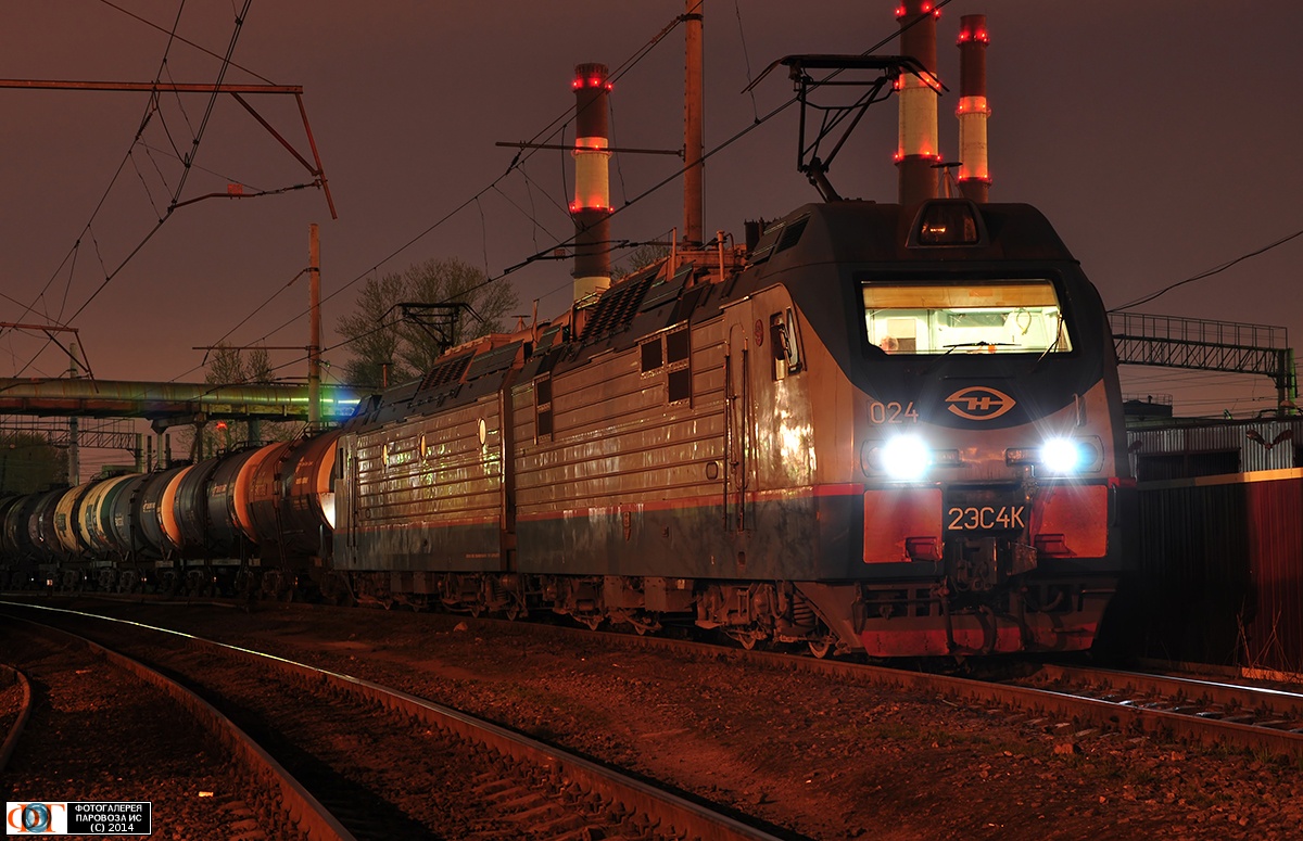 | Электровоз 2ЭС4К-024 с грузовым поездом на станции Нарвская, Санкт-Петербург Автор: Владик | Фото сделано 28.IV.2014, опубликовано 8.V.2014.